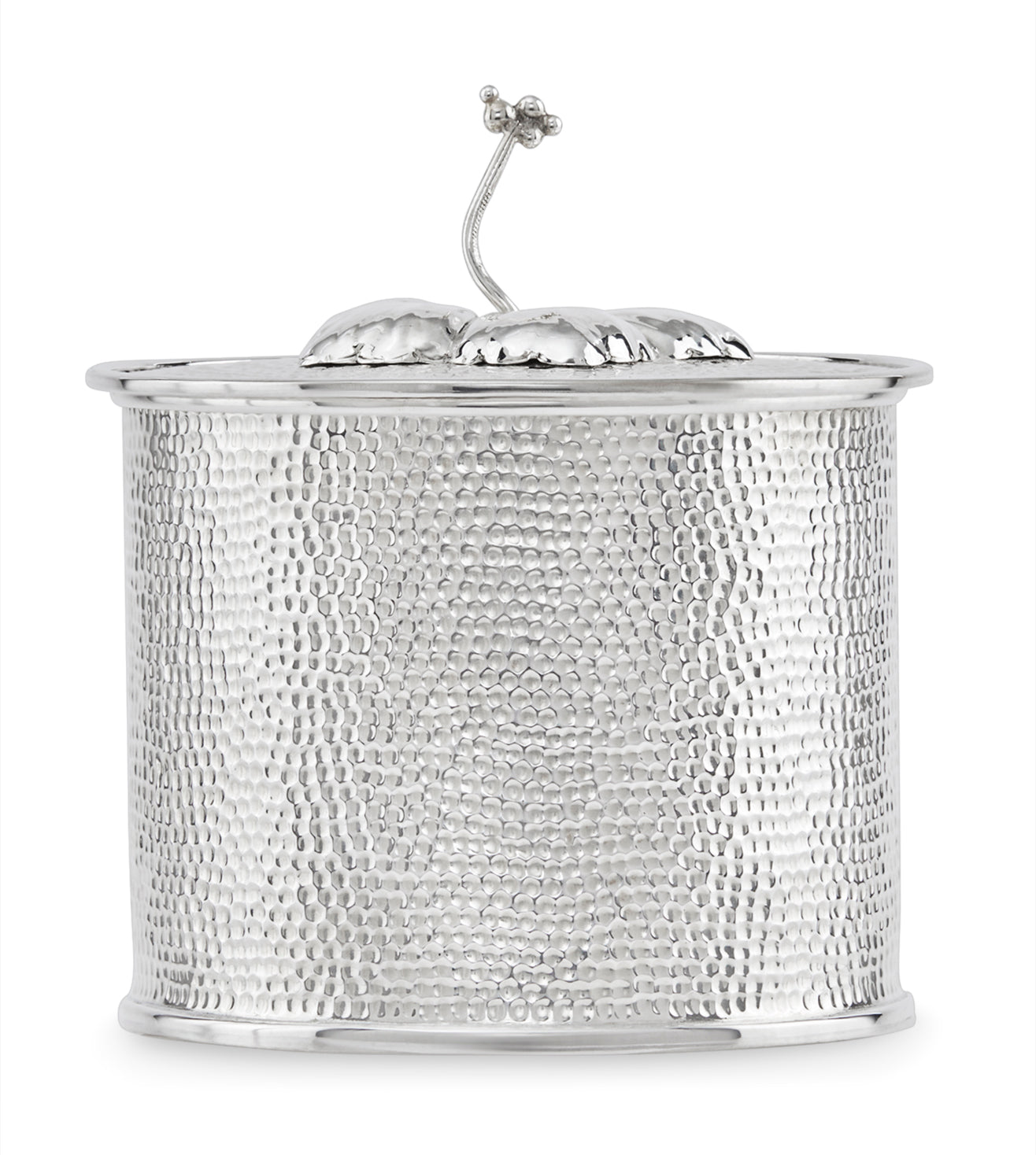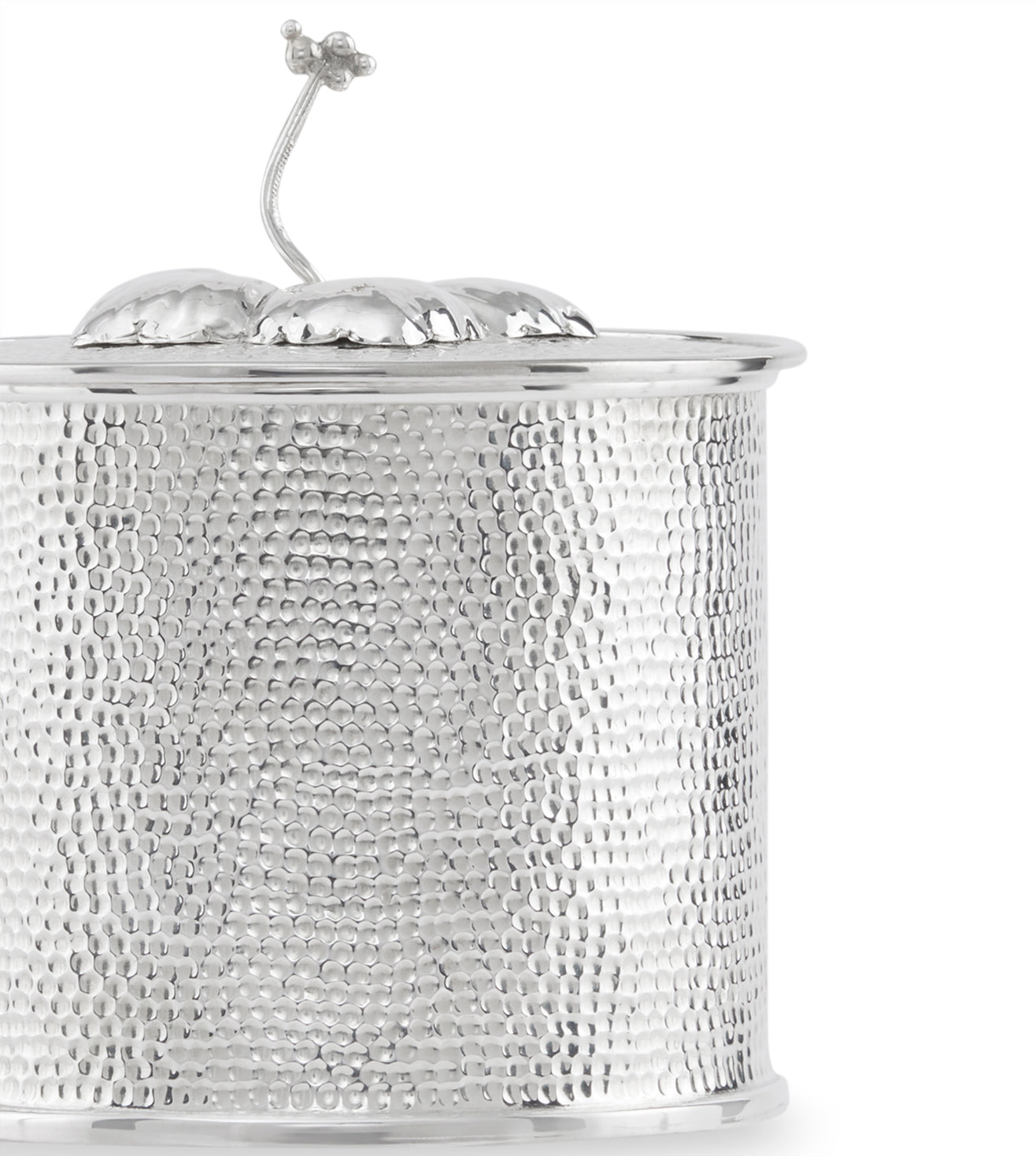 The Seher Box is meticulously crafted, showcasing an elegant silver-toned form with a finely hammered surface that lends it a refined yet artisanal character. The hand-hammered finish creates a textured, faceted look, allowing the surface to subtly catch and reflect light, enhancing the box’s understated sophistication.